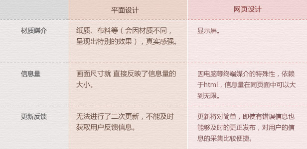 平面設計屬于比較傳統(tǒng)的信息媒介設計,一般會通過張貼、銷售、郵寄派送等形式進行傳播,這樣傳播的方式范圍小且成本較高,相對而言在這方面網(wǎng)頁設計的信息傳播能力卻非常的強,但依賴于第三方媒介的支持,平面設計卻擁有更為廣泛的受眾人群,不同的年齡層對于紙張或書本的信息接受能力總是強于網(wǎng)絡媒體的,畢竟網(wǎng)絡信息獲取的將會存在一個學習成本,在今后網(wǎng)絡信息的不斷普及以及終端媒介用戶體驗的不斷提升,在受眾人群方面在我看來差距會越來越小。
